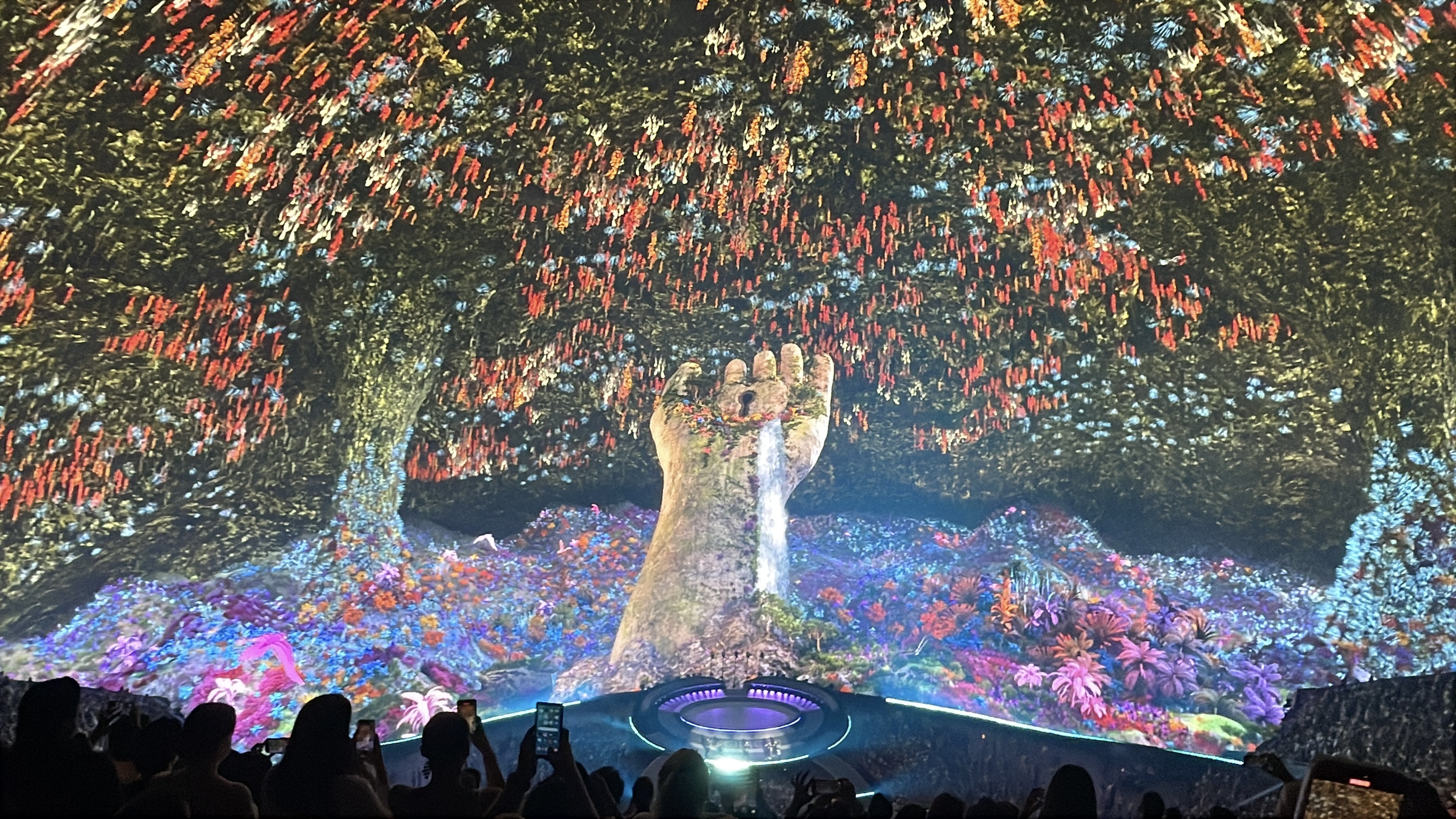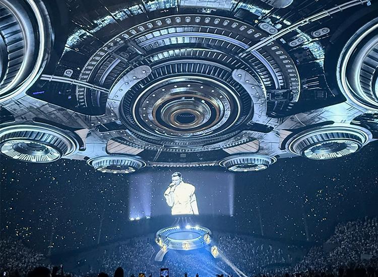 We zaten helemaal bovenin de dome, bijna precies in het midden — en vanaf dat punt viel alles op z’n plek. De opening was meteen mind blowing. Je bent niet zomaar toeschouwer, je wordt volledig meegesleurd. Het scherm is geen decor óm de show, het is de show. Je belandt in een cocon van licht, geluid en beweging waarin je emotie des te harder binnenkomt. Je bént onderdeel van de visuals die zich als een driedimensionale droom om je heen bewegen.